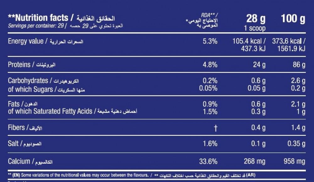 المكونات: بروتين مصل اللبن المعزول، مركز بروتين مصل اللبن، بروتين مصل اللبن المتحلل إنزيميا المعزول، الـ جلوتامين، مزيج من الأحماض الأمينية الأساسية (لـ لوسين، لـ فالين، لـ آيسولوسين، لـ ليسين هيدروكلورايد، لـ فينيلالانين، لـ ثريونين، لـ ميثيونين، لـ تريبتوفان)، ريبوفلافين والكارمين، محليات بديلة للسكر [(سوكرالوز (750 ملغ/لتر)، اسيسولفام بوتاسيوم (450ملغ/لتر)]، يحتوي على مستحلب ليسيتين الصويا.