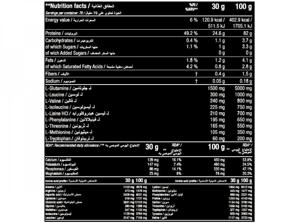 المكونات: بروتين مصل اللبن المعزول، مركز بروتين مصل اللبن، بروتين مصل اللبن المتحلل إنزيميا المعزول، الـ جلوتامين، مزيج من الأحماض الأمينية الأساسية (لـ لوسين، لـ فالين، لـ آيسولوسين، لـ ليسين هيدروكلورايد، لـ فينيلالانين، لـ ثريونين، لـ ميثيونين، لـ تريبتوفان)، ريبوفلافين والكارمين، محليات بديلة للسكر [(سوكرالوز (750 ملغ/لتر)، اسيسولفام بوتاسيوم (450ملغ/لتر)]، يحتوي على مستحلب ليسيتين الصويا.